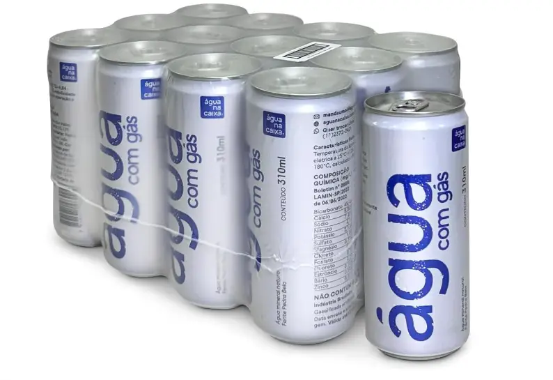 Água na Caixa em lata com gás 350ml, refere-se a uma água mineral gaseificada (ou sem gás) vendida em lata, sendo uma das novas opções da marca Água na Caixa, oferece praticidade e sustentabilidade. Embalagem contém 12 unidades.